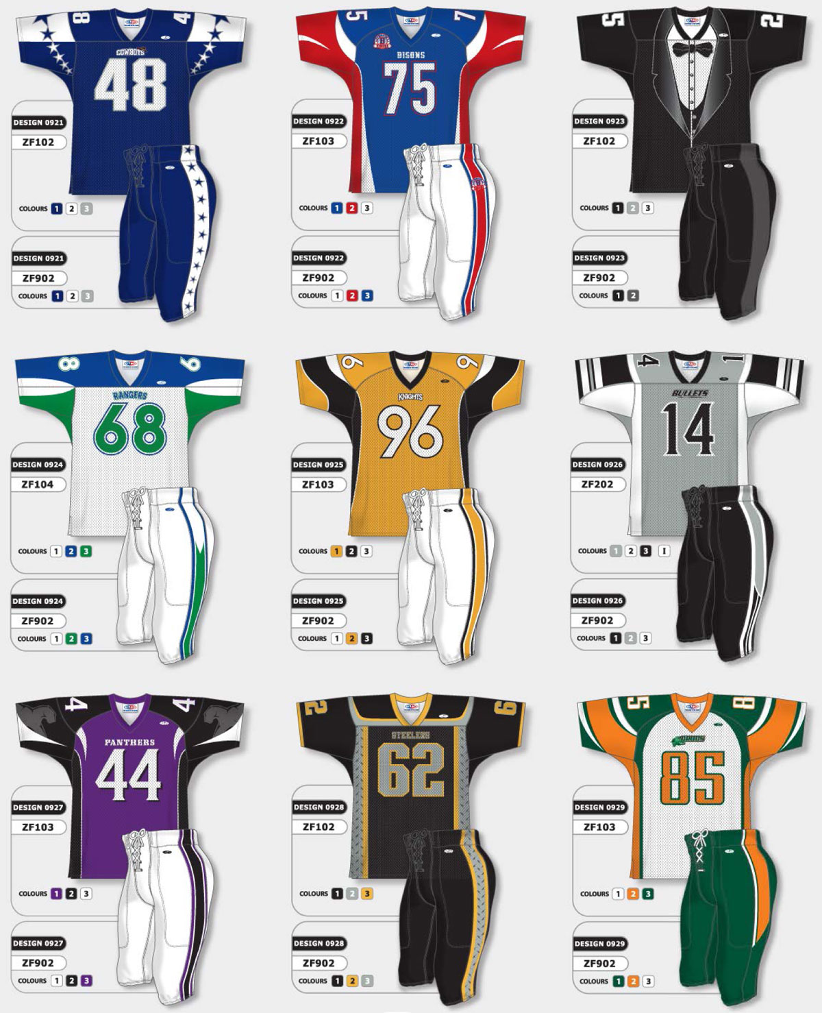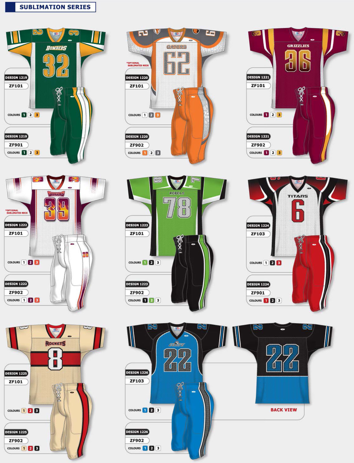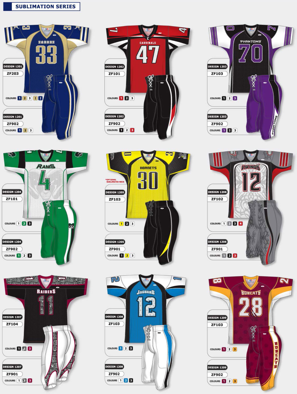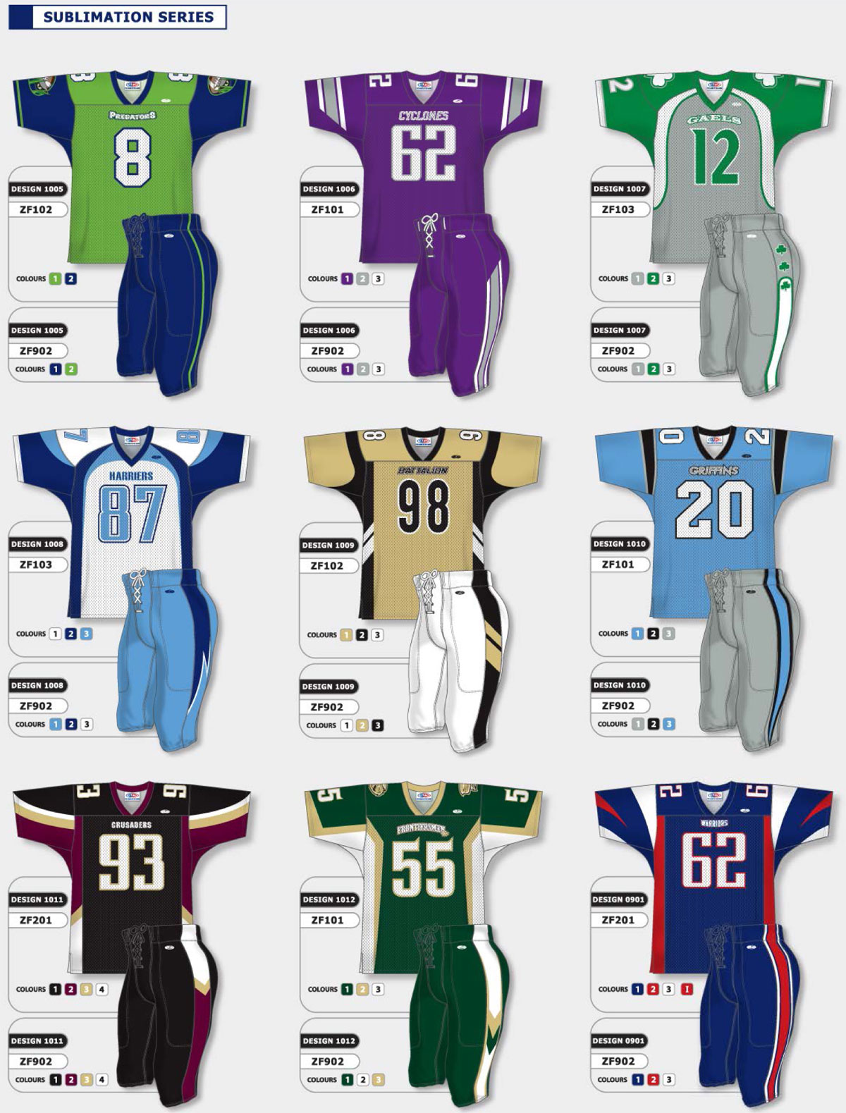 Custom Sublimate Football Jerseys & Pants - All prices listed are in Canadian dollars and do not include shipping. Adult size prices are for Small to 2XL. Larger sizes available. Prices include ALL numbers, team logos/name. Player names and individual sponsor logos/names are extra.